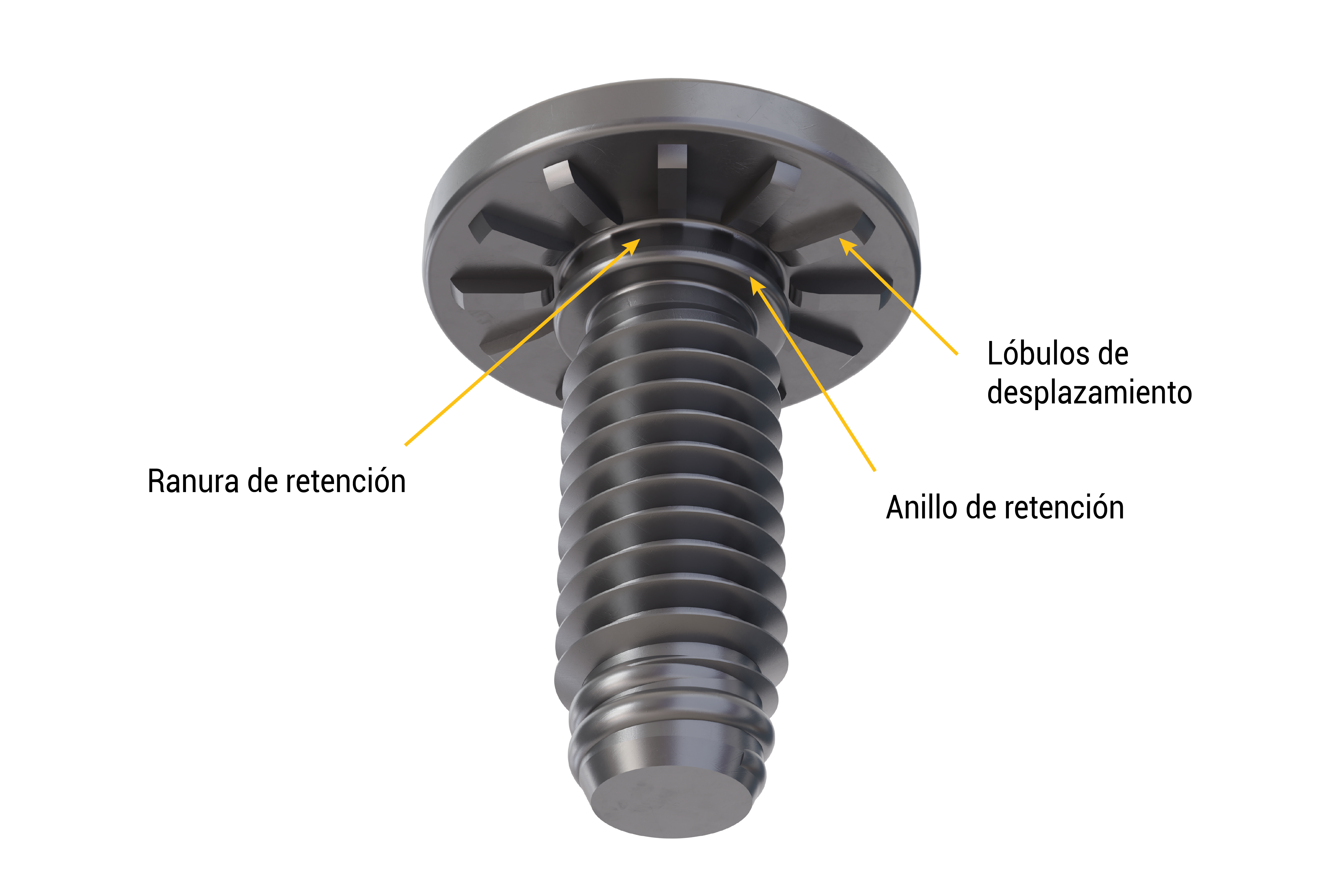 - El material de la chapa desplazado está alojado entre los lóbulos y el anillo de retención, proporcionando una fijación entre perno y chapa con elevada resistencia mecánica.