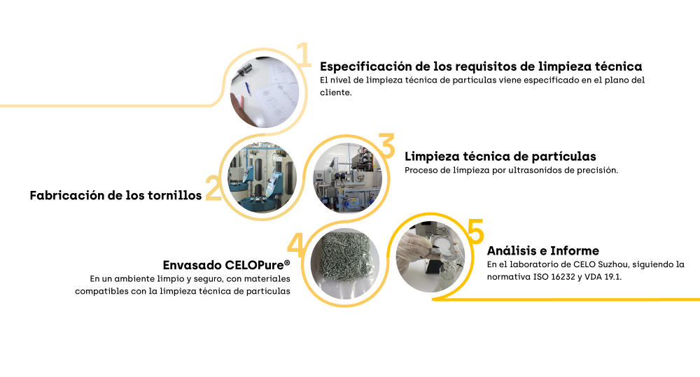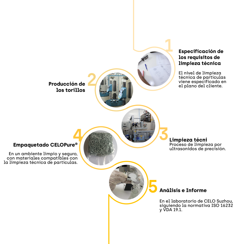 Para hacer frente a la creciente demanda de piezas que requieren una limpieza técnica de partículas, CELO ha implementado el innovador proceso técnico de limpieza - CELOPure® para ofrecer soluciones personalizadas y lograr la mejor limpieza técnica de partículas posible en la superficie de los tornillos.